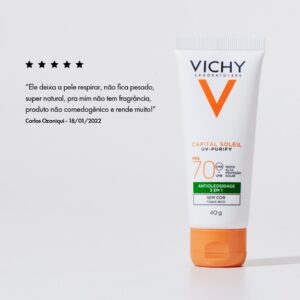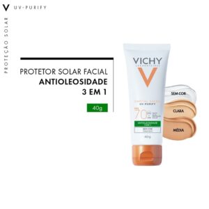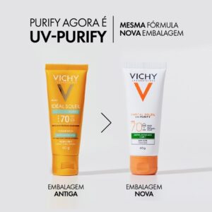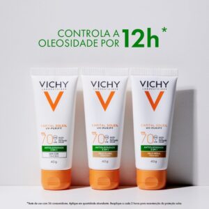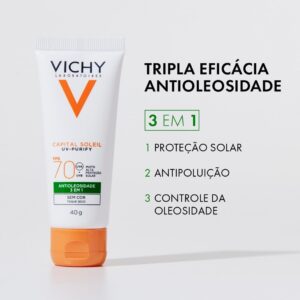 O Protetor Solar Facial Vichy Purify FPS 70 é formulado especialmente para as peles oleosas. Possui textura leve e toque seco que proporciona uma sensação refrescante e confortável, sem deixar a pele com aspecto pesado ou oleoso. Além da proteção solar, o Vichy Purify 70 purifica e revitaliza a pele ao longo do dia, deixando-a com uma aparência impecável e livre de brilho indesejado.
