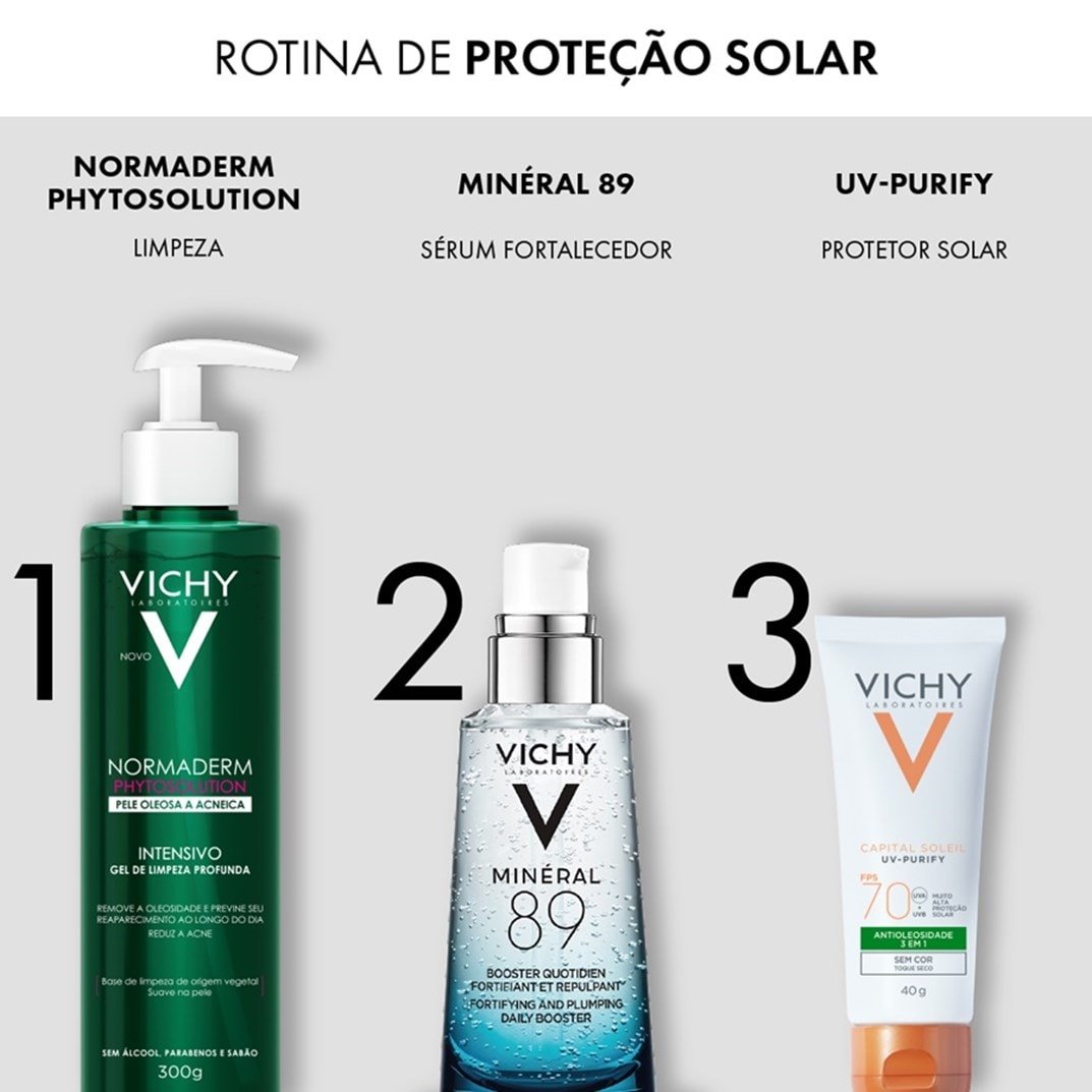 Protetor solar facial sem cor. Vichy Purify FPS 70 é ideal para conferir alta proteção contra os raios UVA e UVB, ao mesmo tempo que controla a oleosidade excessiva.
